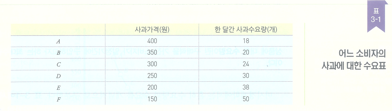 표 3-1은 사과에 대한 어느 소비자의 가상적인 수요 표이다. 이 수요 표에서 사과의 가격이 250원이면 소비자가 한 달에 30개를 구입하고자 하고, 가격이 350원으로 상승하면 20개를, 가격이 150원으로 하락하면 50개를 구입하고자 한다. 이제 이와 같은 가상적인 숫자를 가지고 수요량이 뜻하는 바를 보다 구체적으로 설명해 보자.