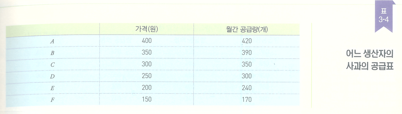 표 3-4는 어느 생산자의 가상적인 사과 공급 표이다. 이 표에 표시된 공급량은 수요량과 마찬가지로 다음 세 가지 중요한 특성을 갖는다. 첫째로, 공급량은 주어진 가격 수준에서 생산자가 판매하고자 하는 최대수량으로서 실제로 판매된 수량과는 구분된다. 둘째로, 공급량은 생산자가 실제로 팔 수 있는 능력을 갖춘 상태에서 판매하고자 하는 상품 수량이다. 셋째로, 상품의 공급량은 대개 일정한 기간을 명시해야만 그 의미가 분명 해지는 유량이다. 상품의 공급량이란 판매 능력을 갖춘 생산자가 일정 기간에 판매하고자 하는 최대수량이다.